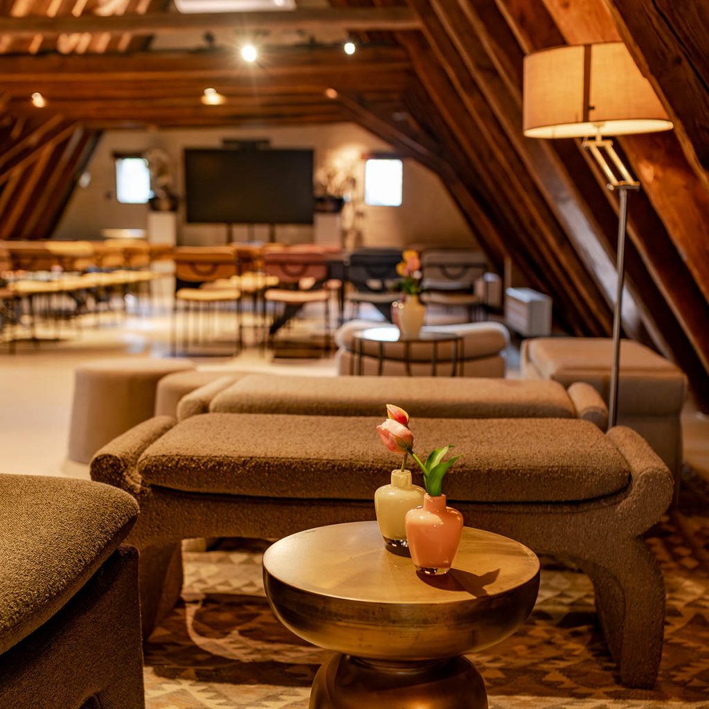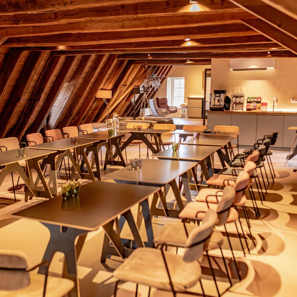 Onze grootste ruimte onder een indrukwekkende monumentale kap uit de 13e eeuw. Aan de voorkant heb je zicht op de Oudegracht en aan de achterkant kijk je op de Neude. Deze ruimte is 120 m² en heeft oude balken tot aan de ‘nok’ op 5 meter hoogte. De ruimte beschikt over een eigen pantry met dubbele koelkast en een zeer ruim buffet gedeelte. Voor de heerlijke verse koffie gedurende dag staan 2 Jura’s ter beschikking. Onze Loft beschikt ook over een gezellige zit.